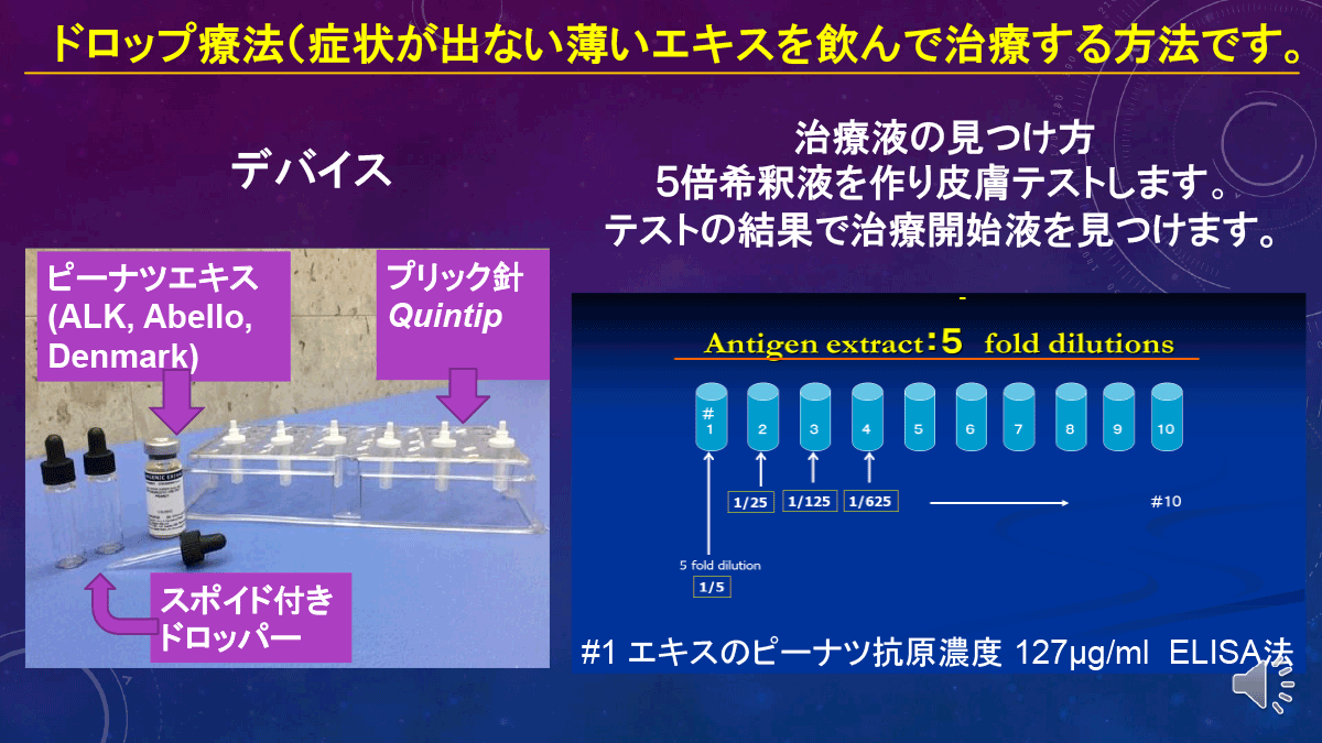 食べ物から抽出したタンパクエキス(液体)をさらに何倍にも希釈して、飲み込んでも症状が出ない量をプリックテストの結果から判定し、実際に飲んでみて安全性を確かめます。